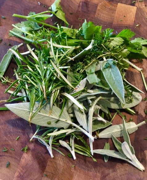 2 large handfuls of fresh herbs – rosemary, sage, thyme and oregano picked and chopped (you can replace with a tbsp of dried Herb de Provence)
