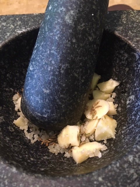 4. In a pestle and mortar pound the garlic cloves with a large pinch of sea salt and the cumin seeds. The salt acts as a grip to the garlic whilst also seasoning the dish. When you have a garlic paste add to the aubergine mix.