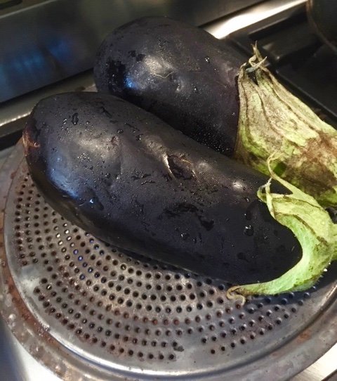 2. Pop the two washed, whole aubergines on and let them cook. The aubergines will need turning but otherwise you can leave them to do their business whilst you do something else. They are ready when the skins are black all over and the aubergine is soft to touch.