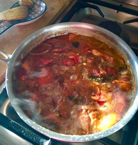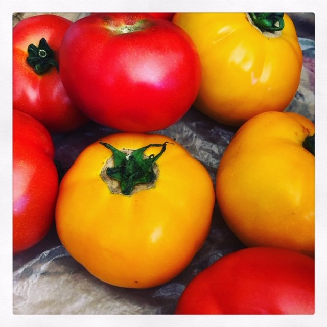 I was very excited to see the return in the local farm shop of one of my favourite summer foods – the tomato! Especially as they were big, ripe and there was choice of varieties. From the classic round vine (Rose de Berne), to ancient (Crimée) and even orange ones. However the first of the seasons tomatoes tend to be rather hard and not as flavoursome as later on in the summer so I prefer to cook with them. It won’t be long before lunch will consist of one massive, juicy tomato, fresh basil, a glug of quality local olive oil, a drizzle of balsamic and some rock salt and pepper. Chris was amazed when we first moved here when our elderly neighbour explained that he had eaten just one tomato for lunch. He felt sorry for him, until he saw the size of the tomatoes!! A far cry from the tasteless, rubber bullets sold in UK supermarkets all year round!