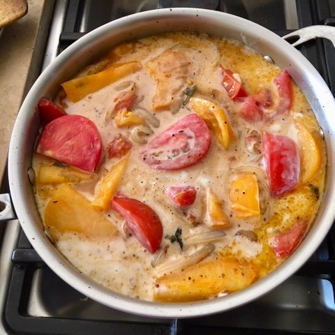 - Artistically arrange the tomatoes on top of the onion and coconut mixture, gently poking them into the sauce. Cook for a good half hour on a medium low heat, and here is the tricky part (!) without stirring! You want the tomatoes to retain their shape, if you stir they will turn into a mush!