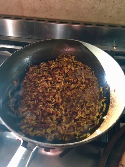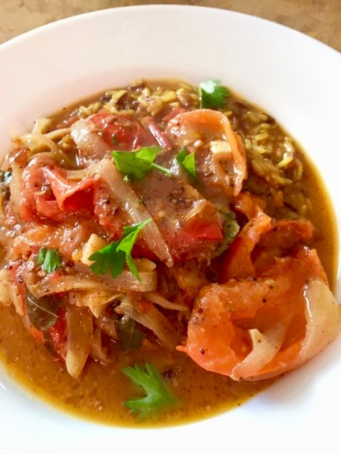 Anyhow last night it was a toss up between tomate provençal or tomato curry, interestingly Louis chose the latter. This is a really easy dish to make, but it does work better if you have at least two different colours of tomato. I served with a simple pilau rice made with local Carmague wild rice flavoured with cardamom and turmeric, and naan bread as there was a lot of juice!